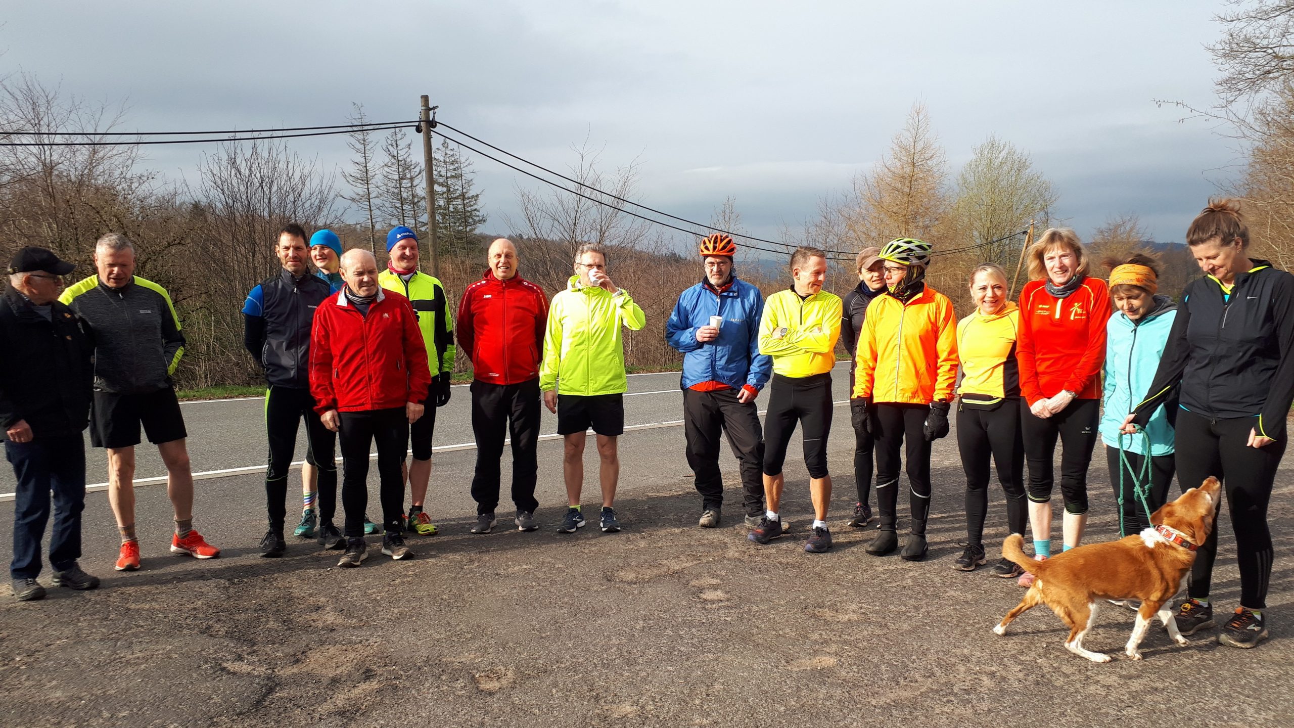 Auf dem Himmelsberg kamen fast zeitgleich mit den Frühstartern die Läuferinnen und Läufer an, die sich vom Himmelsberg nach Melsungen zum Vereinsheim auf den Weg machen wollten. Nach einem obligatorischen Gruppenfoto startete der Tross um 9:00 Uhr, um nach 16 km durch den Wald nach Melsungen zu gelangen.